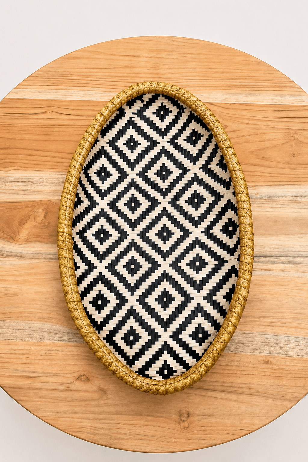 Su diseño de batea con borde tejido en tono beige y negro con detalles dorado resalta por su carácter único, aportando calidez, textura y sofisticación a cualquier espacio.