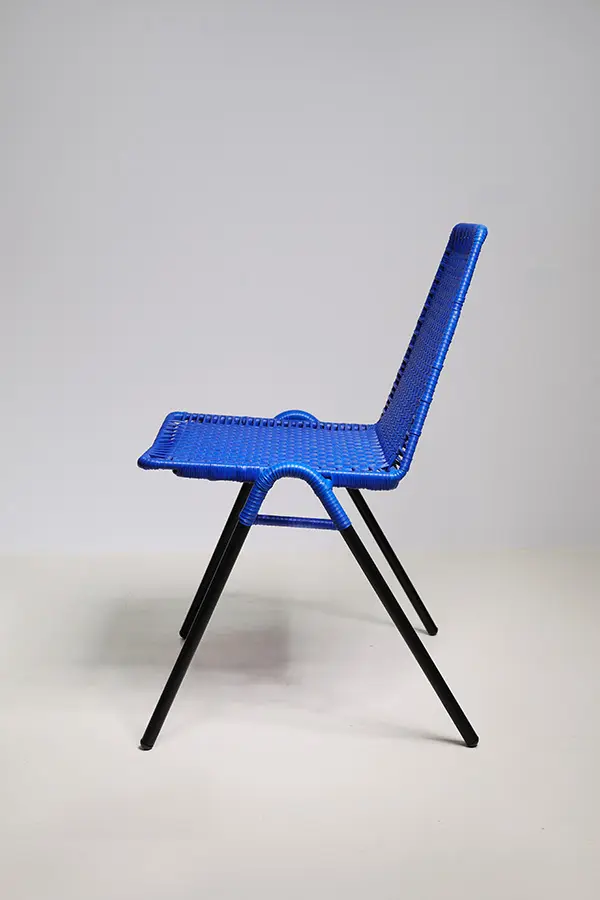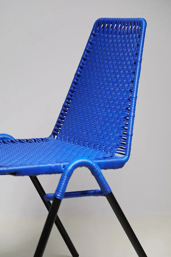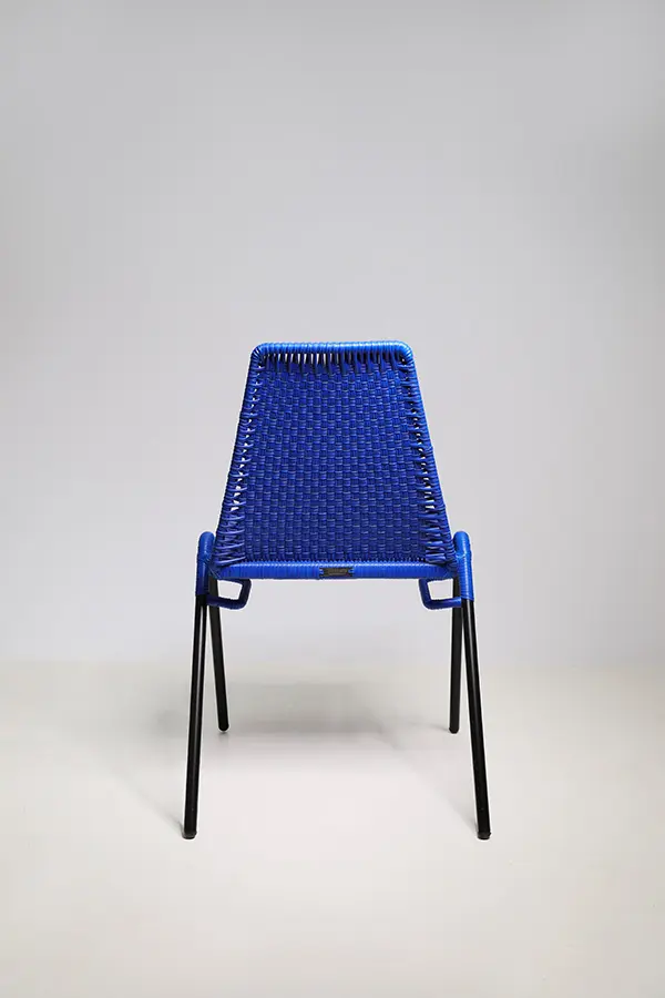 La silla artesanal Finca I en color azul destaca por su diseño apilable y su estructura en acero recubierta con pintura electrostática, que aporta resistencia y estabilidad. Su asiento tejido en cordón sintético, elaborado a mano, añade un valor único gracias a la técnica artesanal que lo convierte en una pieza exclusiva y funcional.