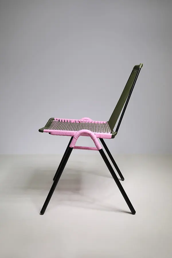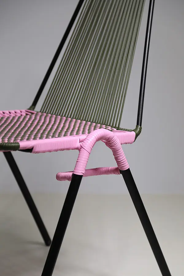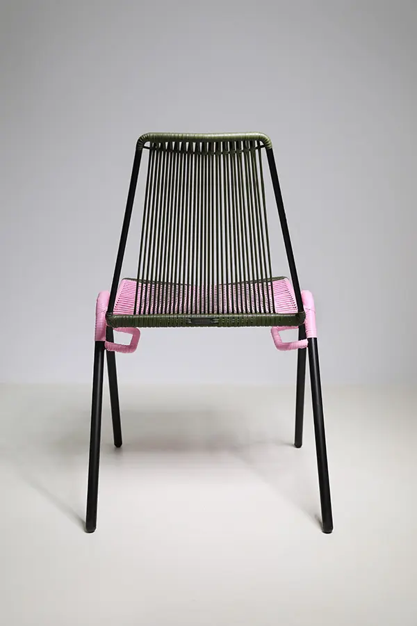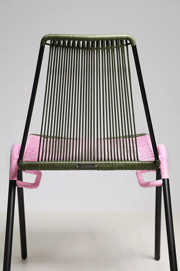 La Silla Finca I Lite Verde Militar y Rosa es una pieza artesanal única, tejida a mano en cordón sintético con patrón entamborado, que combina la resistencia del acero recubierto con pintura electrostática y la belleza de los tonos verde militar y rosa. Su diseño sin brazos y apilable la convierte en una opción práctica y elegante para distintos espacios.