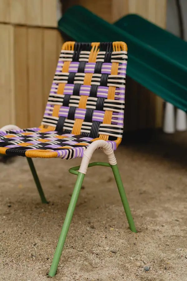 Elaborada a mano en el Caribe colombiano, la Finca Kids está tejida con cordón plástico reciclado sobre una estructura metálica pintada, lo que garantiza durabilidad, fácil limpieza y colores vibrantes que alegran cualquier espacio.