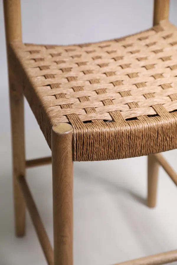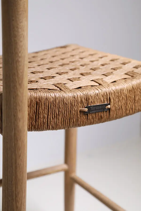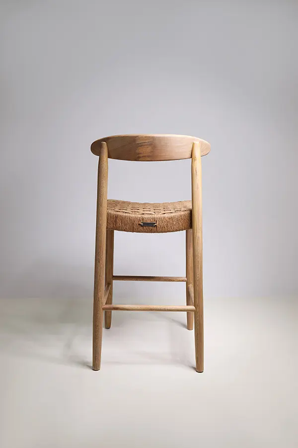 Este taburete está diseñado para uso en comedores, escritorios o barras, adaptándose a espacios protegidos. La combinación de madera noble y tejido artesanal asegura una pieza sólida, estética y con carácter, que se integra fácilmente en ambientes modernos y rústicos.
