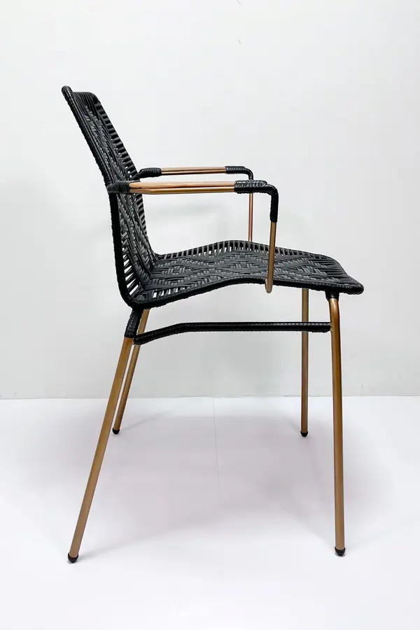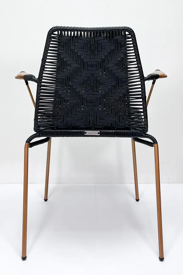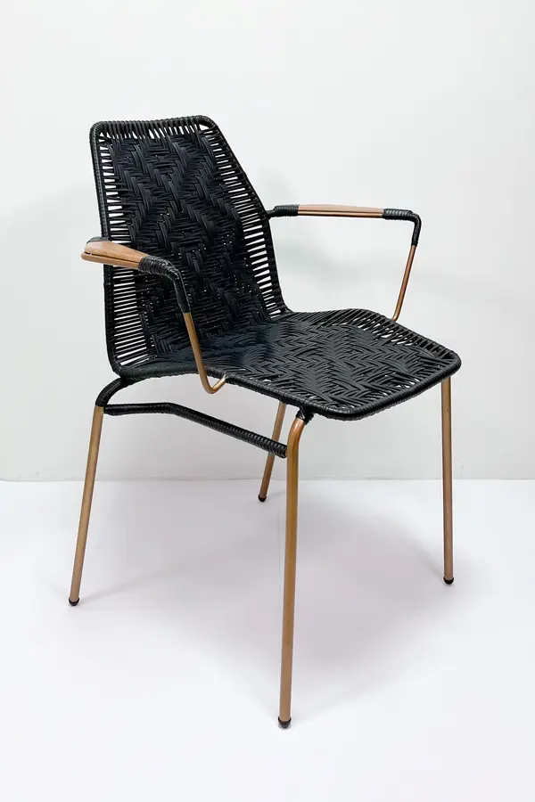 La Silla con brazos Perla II artesanal aporta distinción y carácter a cualquier espacio. Con una estructura en acero acabado cobre, brazos en madera y tejido artesanal Ariguaní en color negro, ofrece una combinación única entre durabilidad, comodidad y diseño contemporáneo.
