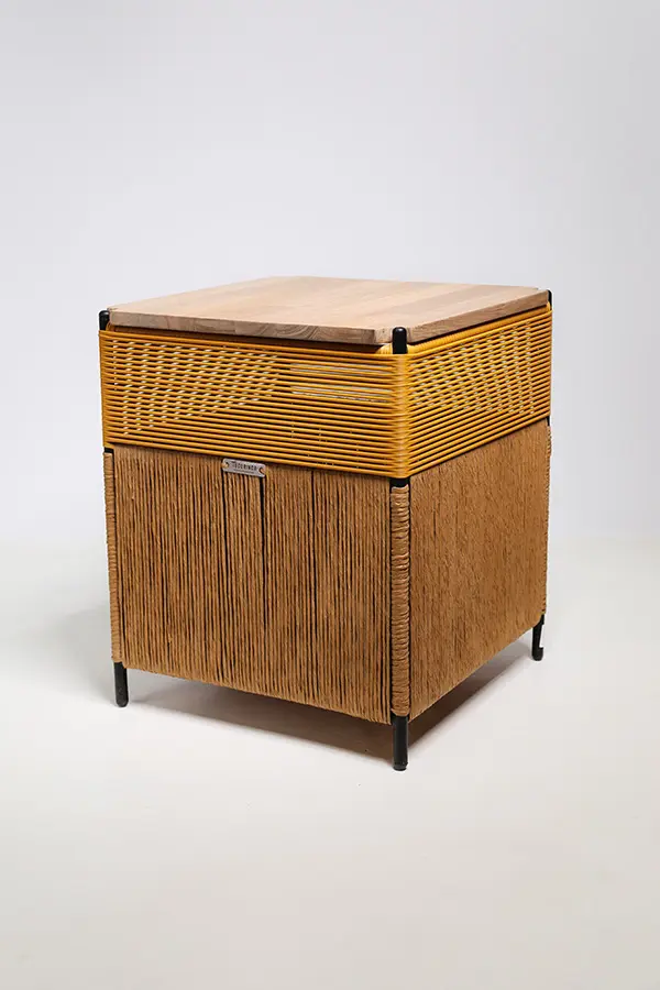 Transforma tu espacio con esta mesa auxiliar con tapa removible, ideal como mesita de noche con cajón y almacenaje oculto. Su diseño combina un vibrante tono mostaza con detalles en cordón cienaguero, cubierta de roble o acacia, y estructura negra que aporta sofisticación a cualquier ambiente. Perfecta para interiores que buscan funcionalidad sin perder estilo, esta mesita te ofrece espacio interno para guardar lo que necesites, manteniendo siempre el orden y la elegancia.
