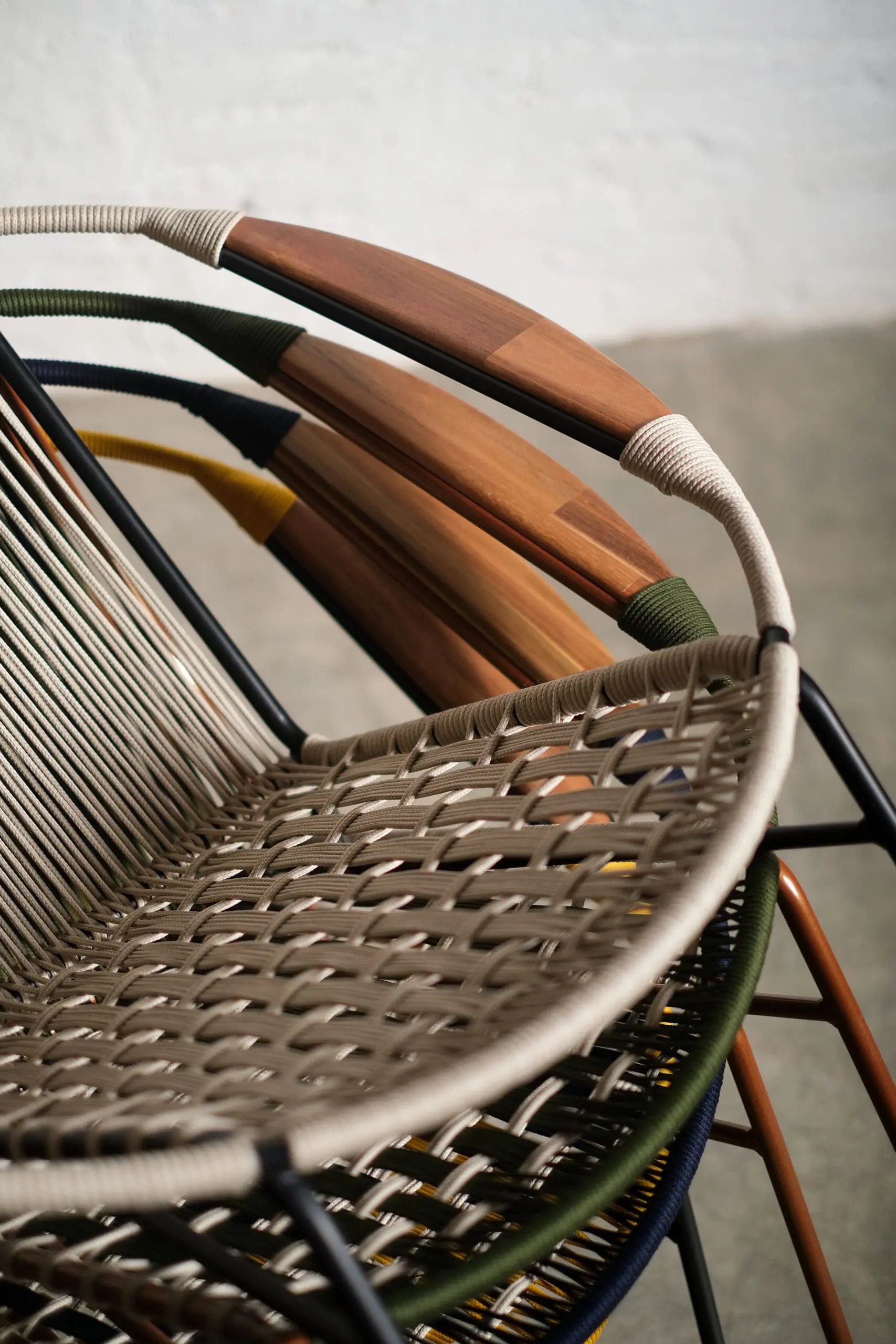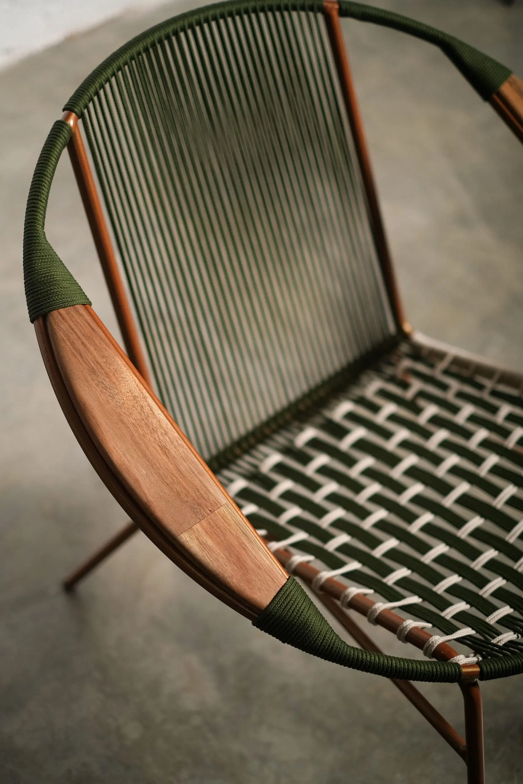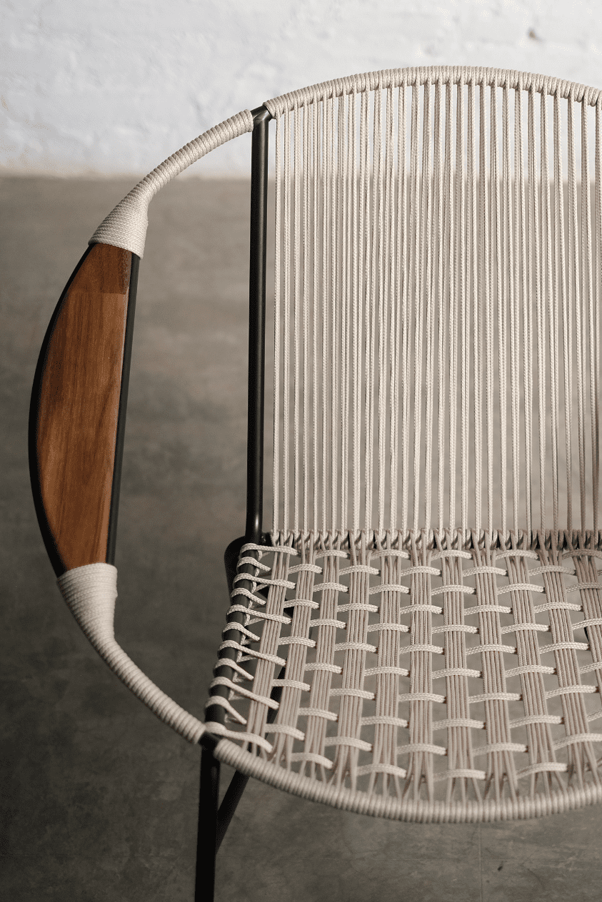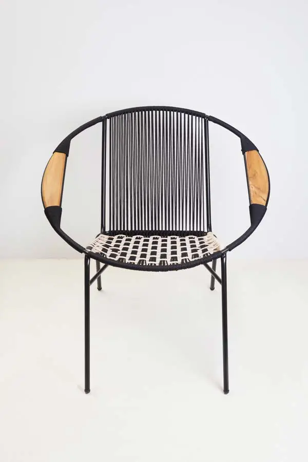 Su estructura de acero recubierta en pintura electrostática garantiza resistencia y durabilidad, mientras que el asiento en cuerda 100% artesanal aporta textura, autenticidad y un acabado único en cada pieza. Los brazos en madera de teca añaden un toque natural y elegante que completa su diseño.