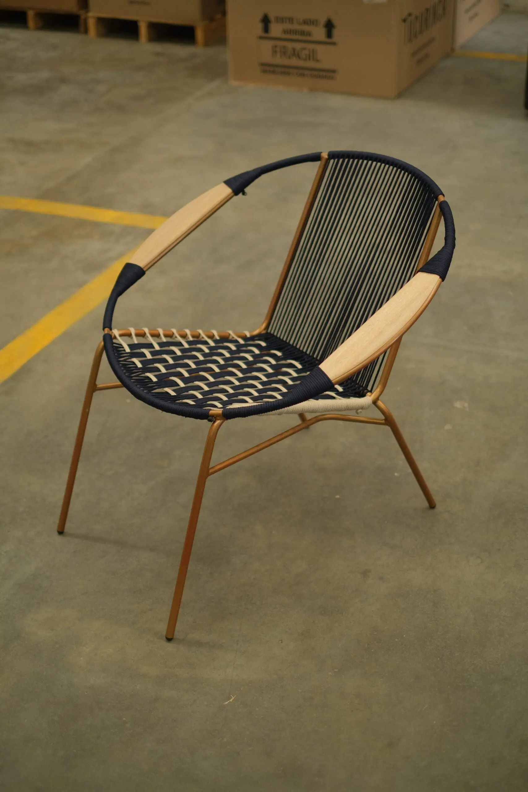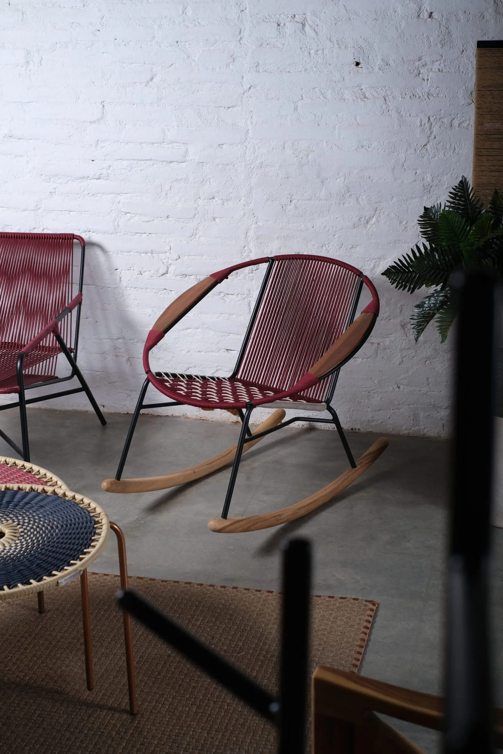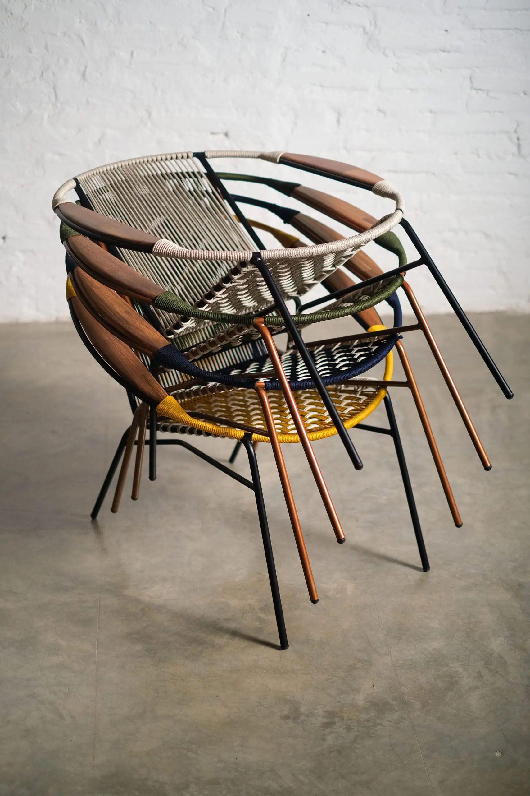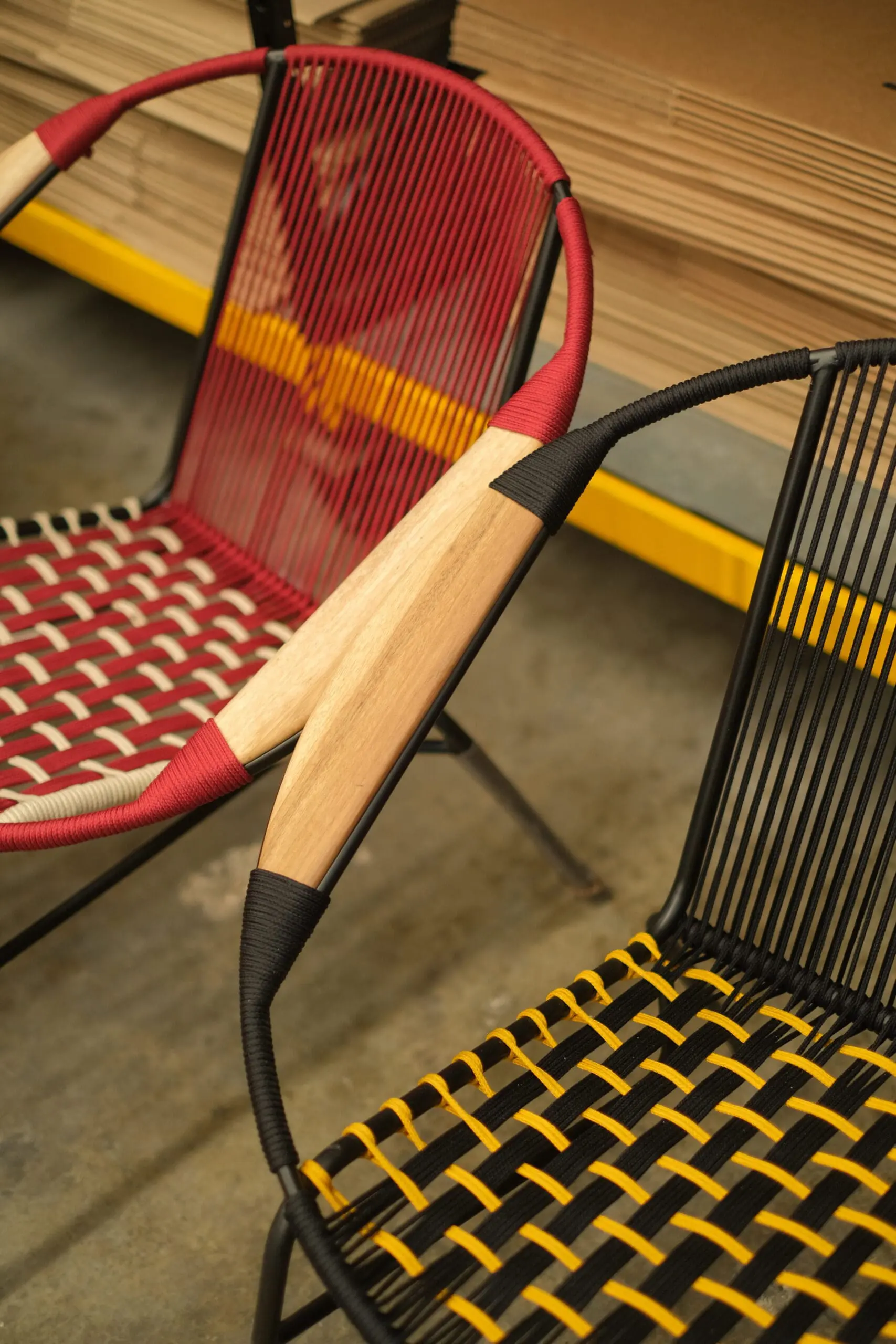 Su estructura de acero recubierta en pintura electrostática garantiza resistencia y durabilidad, mientras que el asiento en cuerda 100% artesanal aporta textura, autenticidad y un acabado único en cada pieza. Los brazos en madera de teca añaden un toque natural y elegante que completa su diseño.