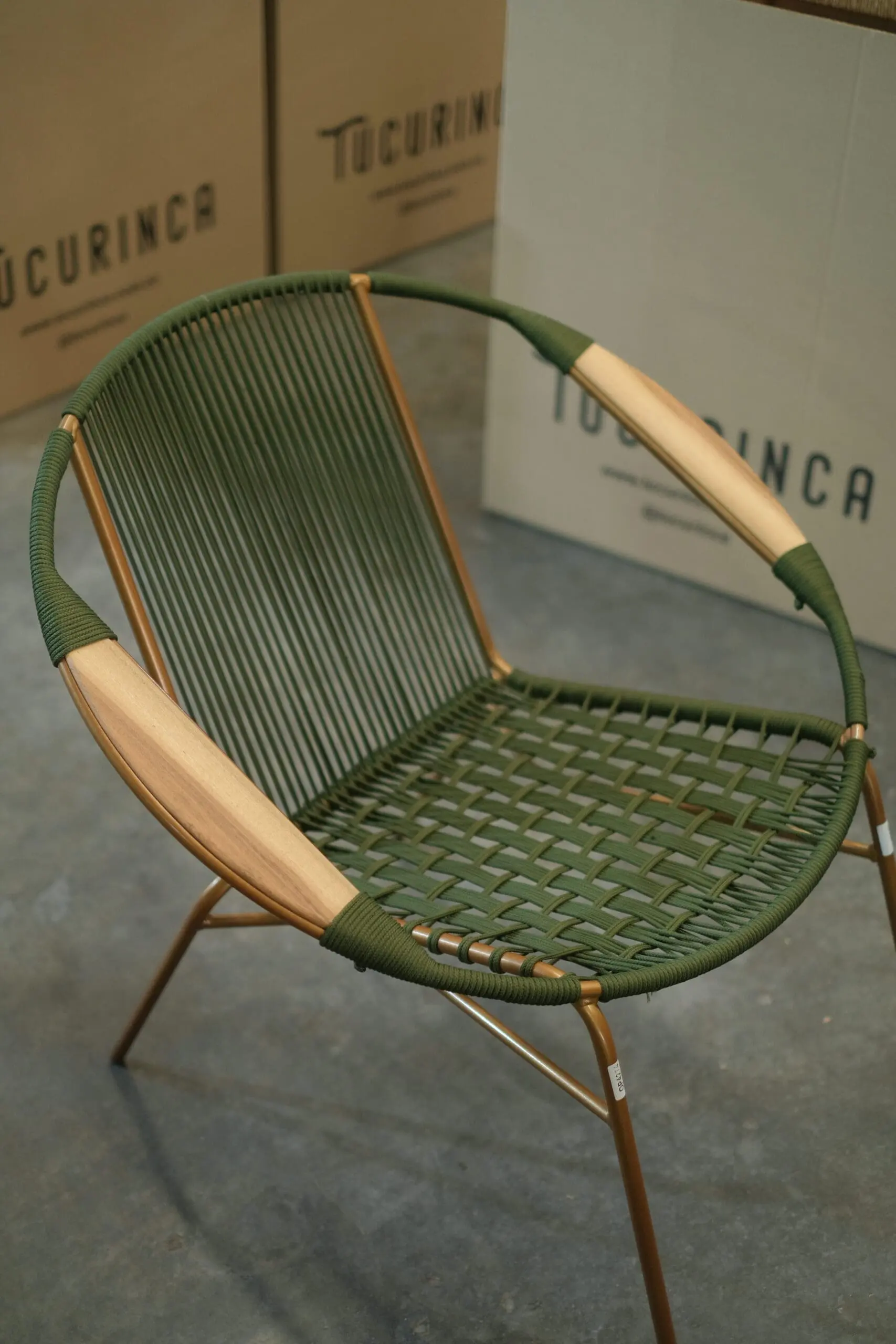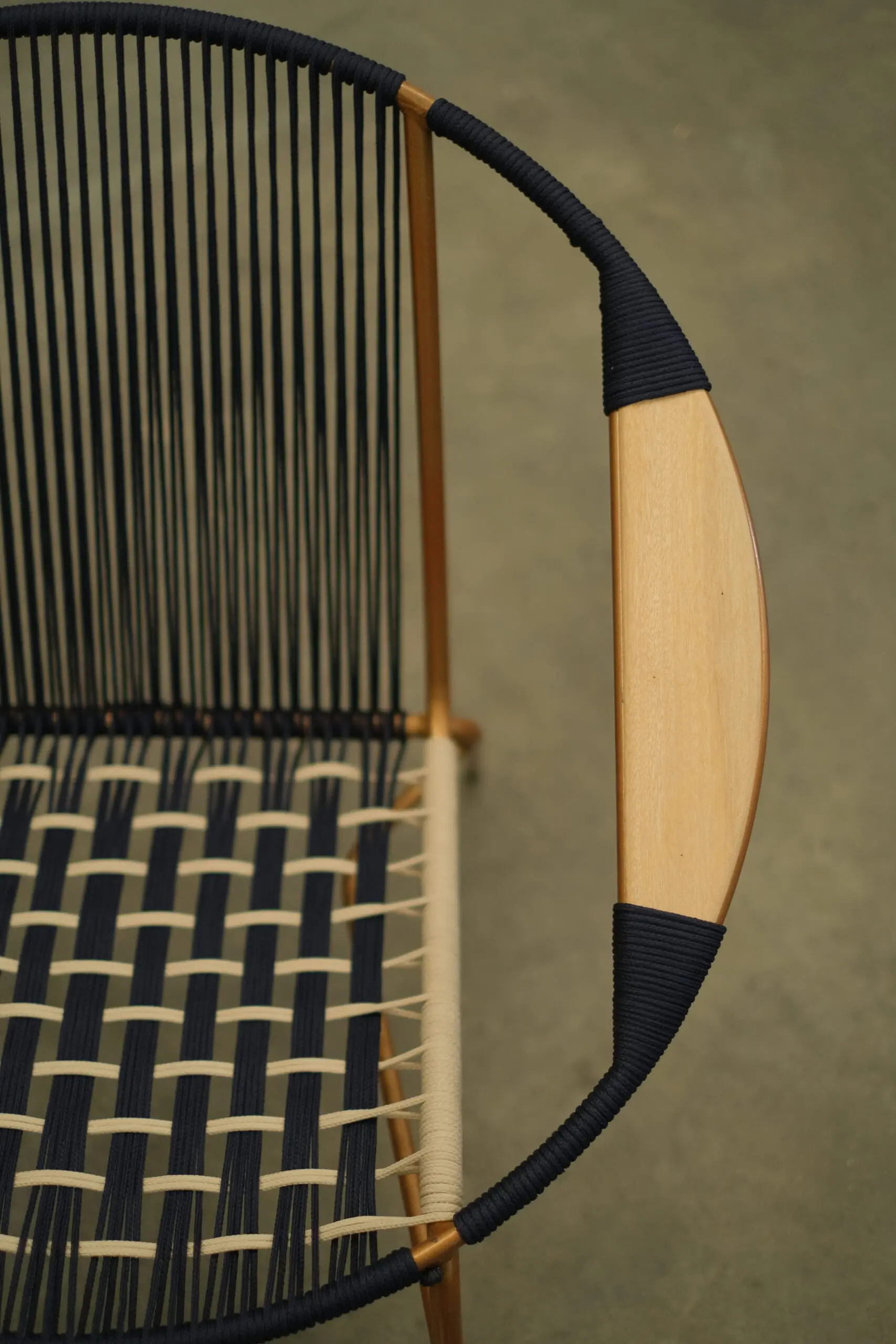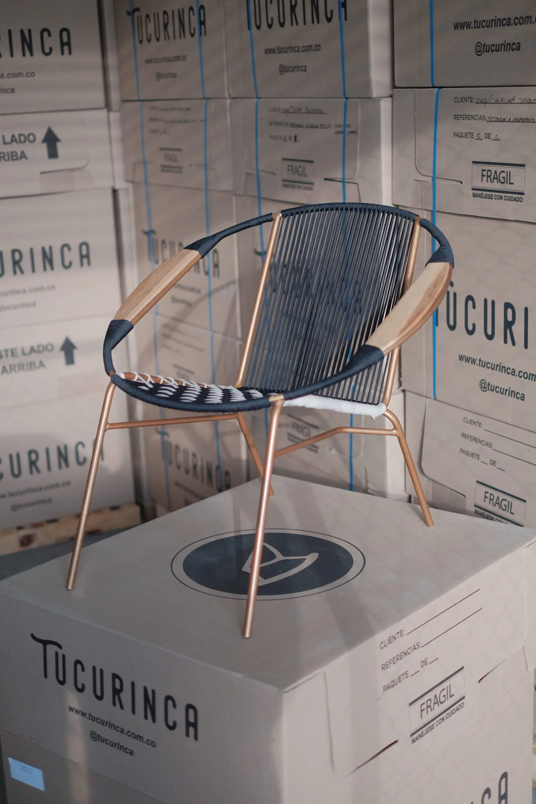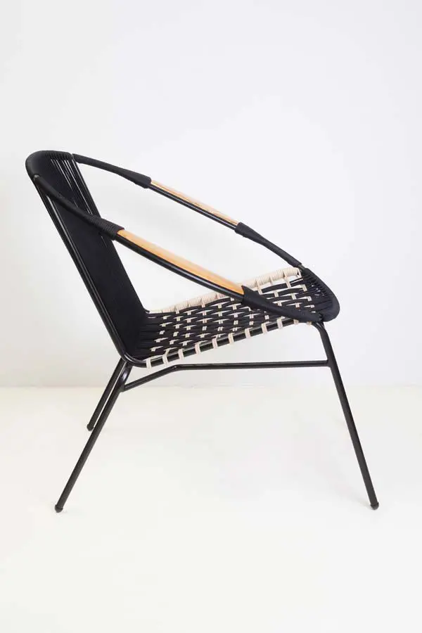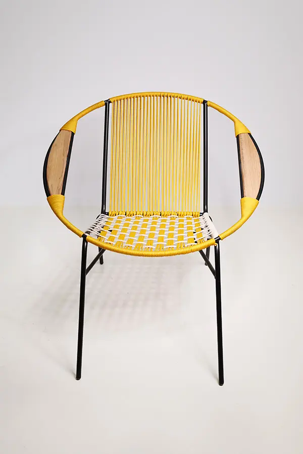 Su estructura de acero recubierta en pintura electrostática garantiza resistencia y durabilidad, mientras que el asiento en cuerda 100% artesanal aporta textura, autenticidad y un acabado único en cada pieza. Los brazos en madera de teca añaden un toque natural y elegante que completa su diseño.