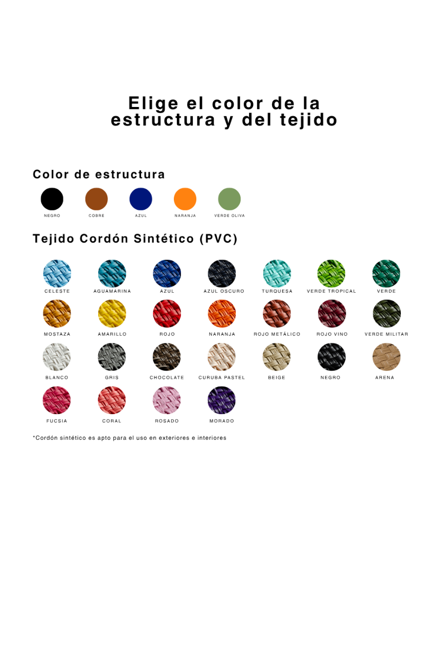 El tejido en cordón sintético es recomendable para interior y exterior cubierto. Para extender la vida del producto aconsejamos protegerlo del sol utilizando nuestros forros o manteniéndolo bajo sombra cuando no esté en uso. La limpieza y mantenimiento del tejido puede hacerse con un trapo húmedo o aplicando silicona con protección UV tipo Simoniz UV3. En caso de que el polvo quede atrapado entre el tejido, se recomienda realizar una limpieza profunda utilizando una pistola de agua a presión.