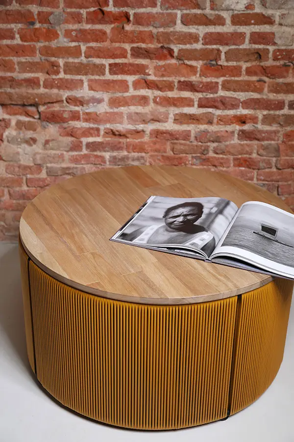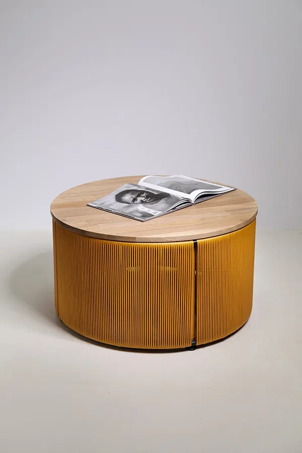 Su acabado en color mostaza y su forma redonda tipo tambor la convierten en una opción ideal como mesa de centro para salones modernos, espacios boho o ambientes contemporáneos. El tejido en cordón sintético añade un toque único y artesanal.