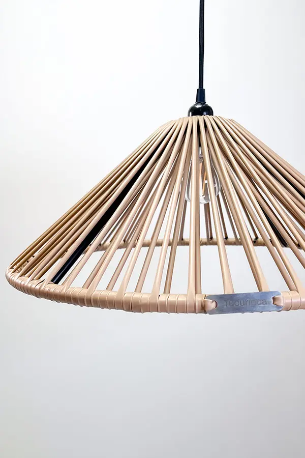Ideal como lámpara colgante para interiores o exteriores cubiertos, aporta calidez, textura y carácter a cualquier espacio. Disponible en combinación de dos colores o en versión Colorinche (multicolor), es perfecta para quienes buscan un toque original y natural en su decoración.