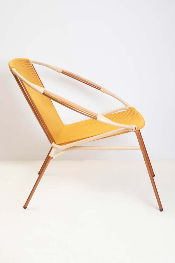 Estructura de acero recubierta en pintura electrostática, tejido 100% artesanal en cordón sintético, brazos en madera teca.