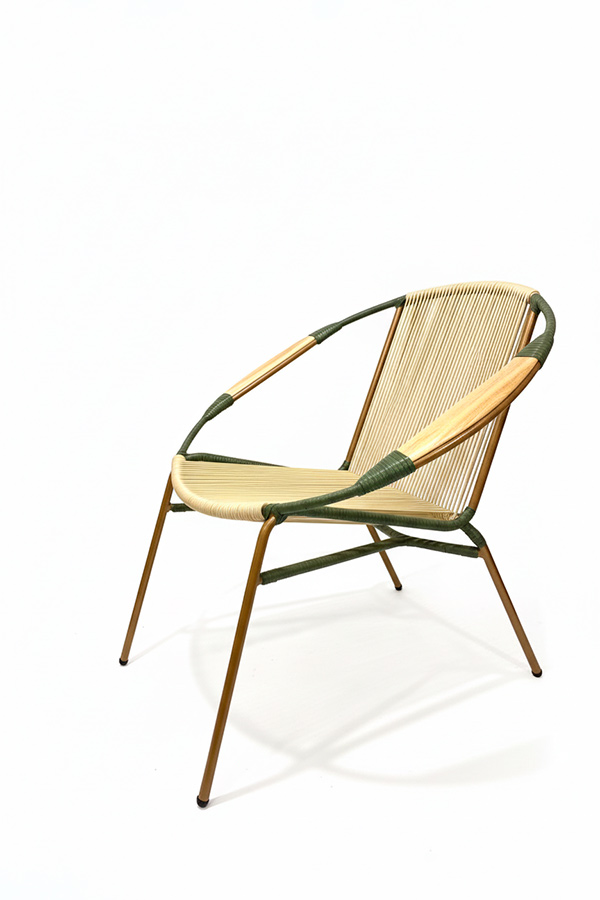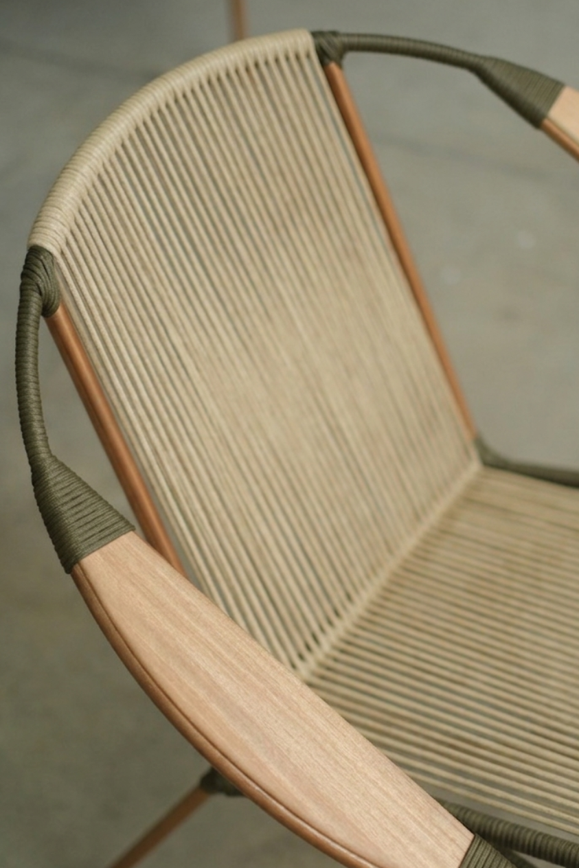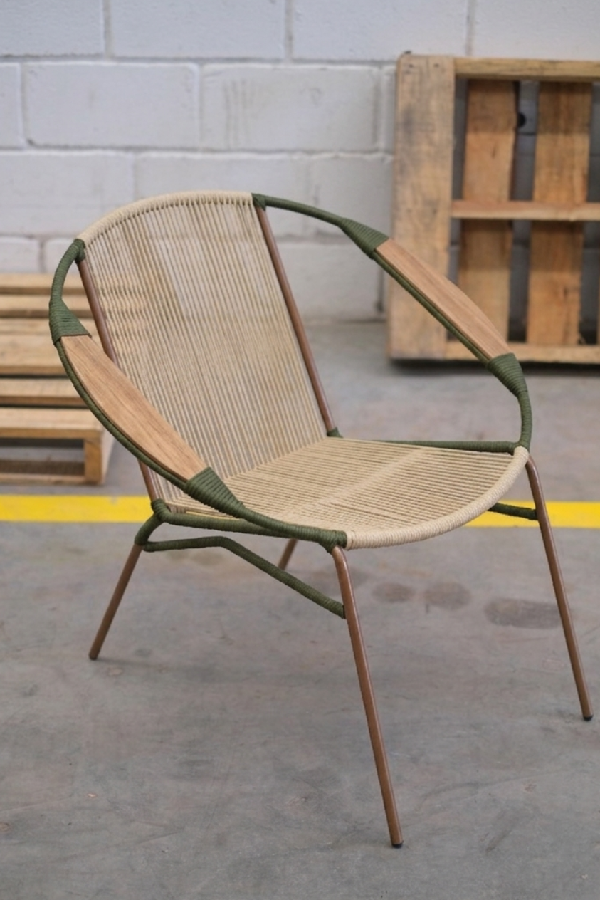 La silla lounge artesanal Tucurinca en tejido de cordón tubular sólido destaca por su diseño único, su gran resistencia y su carácter artesanal. La combinación de beige con verde militar aporta un estilo elegante y atemporal, mientras que los brazos en madera de teca ofrecen un acabado cálido y sofisticado, perfecto para espacios con personalidad.